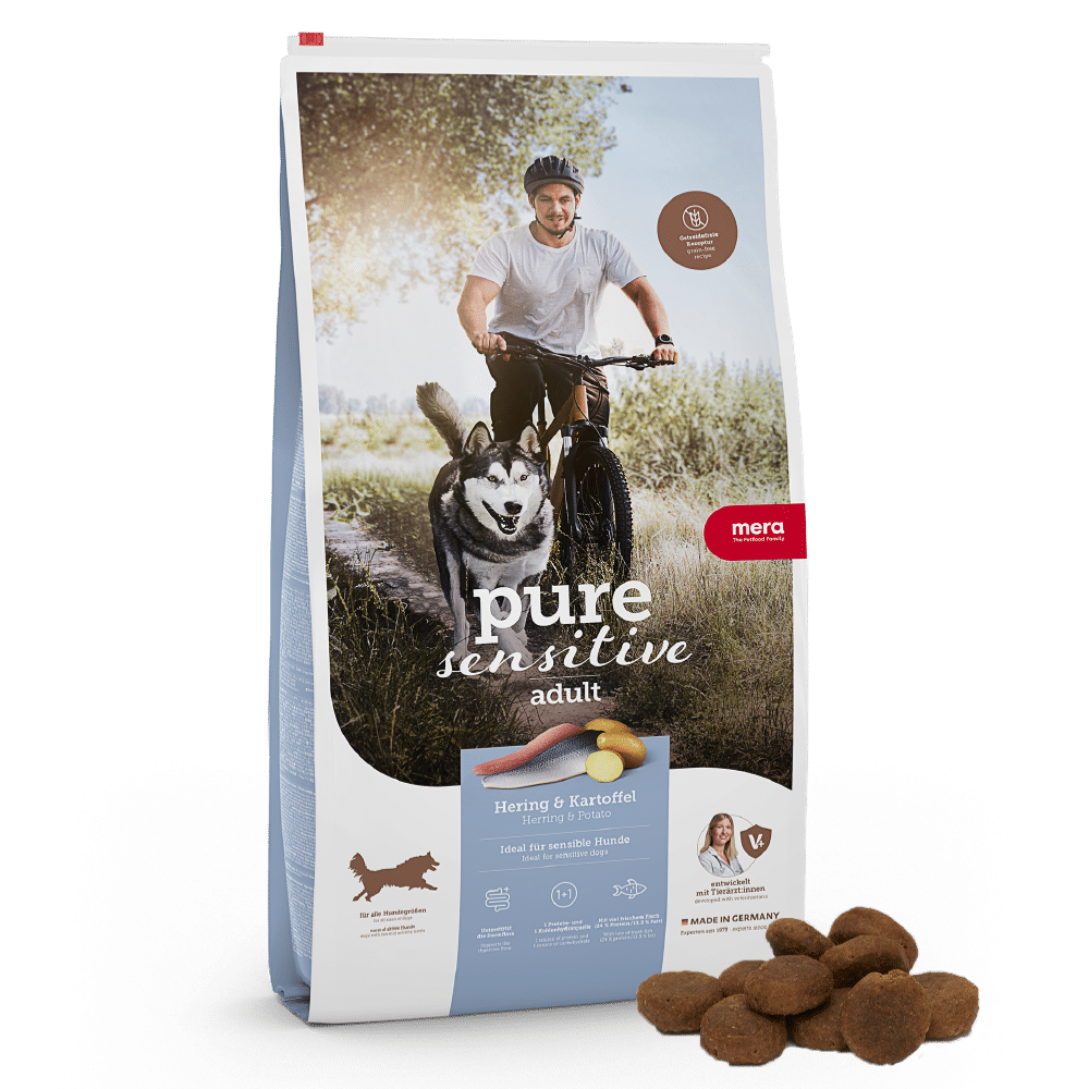 MERA PURE Sensitive Fresh Meat Herring & Potato is the ideal choice for dogs requiring a clean, low-allergen diet. By using fresh, easily digestible herring as the sole animal protein source combined with readily digestible potatoes, this recipe is 100% grain-free.