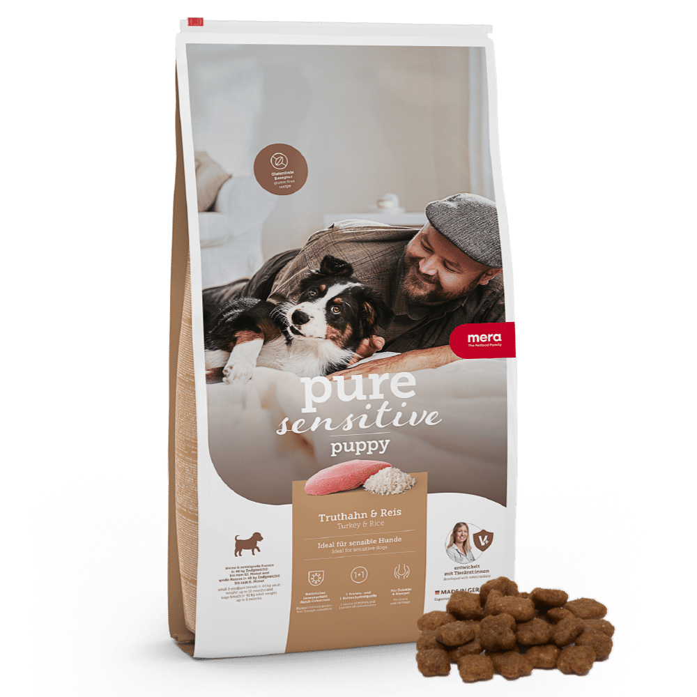 For large breed puppies (expected final weight over 40kg), we recommend transitioning from MERA PURE Sensitive Puppy to MERA PURE Sensitive Junior Turkey & Rice from 6 months of age until adulthood. This ensures a controlled growth rate specifically for larger skeletal structures.